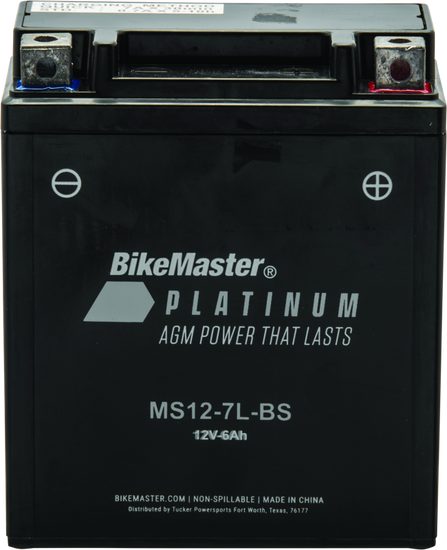 If you're looking for a maintenance free and non-spillable battery for your bike, the Platinum AGM battery by BikeMaster® is for you. Manufactured from absorbed glass mat that captures electrolytes, these batteries have a longer storage life and higher performance than standard wet batteries. They are permanently sealed so that you do not need to check levels or add water. This battery by BikeMaster® comes with a one-year warranty.