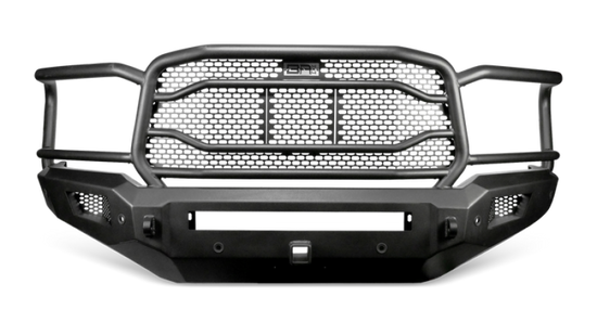 Introducing our sleek and modern front bumper, designed with ample clearance to enhance your vehicle's performance. This bumper contours and follows the body lines for a seamless look, featuring a one-piece wrap-around design that protects the grille and headlights. Constructed with a 2" main tube and 1.25"-1.50" supporting tubes, it ensures robust protection. The mesh screen allows maximum airflow while safeguarding vital components. Integrated 2" receiver and shackle recovery mounts provide reliable recovery options. Light fitment includes a 30" dual row LED bar and 2 cube LEDs, ensuring excellent visibility in all conditions. OE sensor compatible, it includes a skid plate for added protection. Made from 3/16" and 1/4" cold roll steel, this bumper is non-winch compatible and features easy bolt-on installation. Finished with a durable two-stage light texture black powder coat, it offers long-lasting protection and a sleek appearance. Backed by a 3-year finish warranty and a limited lifetime warranty, this bumper is perfect for those seeking a combination of style, strength, and practicality.