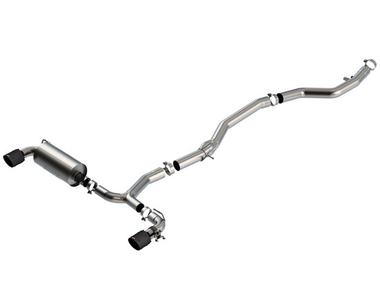 The Borla(R) ATAK(R) system 140826CFBA, is specifically tuned for performance and sound on the GR Supra?s 3.0L twin-scroll turbocharged inline six engine. Our system is designed to be drone-free so you can get the head-turning sound of the ATAK(R) and still enjoy a comfortable cabin during cruise. This Cat-Back(TM) features a 3.5" pipe diameter that splits into dual 3" and comes with 4.5" Carbon Fiber tips with black anodized centers to complete the look of the exhaust. It includes our Polyphonic Harmonizer technology which utilizes patented units that contain pipes of different diameters and lengths to create multiple exhaust notes that harmonize to deliver a clean, rich, full-bodied sound to the BORLA? mufflers. The mufflers then enhance this sound to the character and volume appropriate for this ATAK(R) system. The system also has a functioning valve that works with the factory actuator to change the exhaust volume. As with all Borla(R) products, it is constructed using T-304 stainless steel for increased durability and is backed by our Million Mile Warranty. Bolt-on a Borla(R) and give your Supra the sound it deserves.