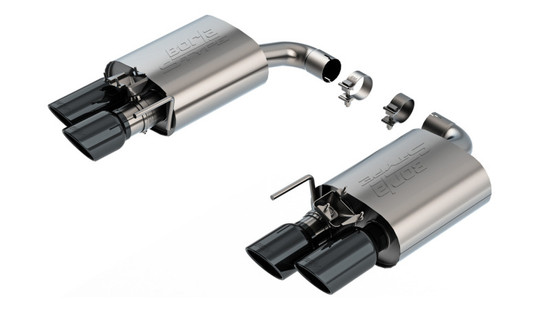 BORLA Axle-Back exhaust system 11985BC is designed to fit the 5.0L Mustang GT that is equipped with Active Valve Performance Exhaust. Muffler contains Polyphonic Harmonizer technology which utilizes patented units that contain pipes of different diameters and lengths to create multiple exhaust notes that harmonize to deliver a clean, rich, full-bodied sound. It features 4" black chrome on T-304 stainless steel tips and the classic S-Type sound level. Using BORLA Stainless Steel Polish p# 21461 is NOT recommended with these black chrome tips. We suggest cleaning the tips with hot water and a microfiber cloth. Systems with bright chrome on T-304 stainless steel tips, and carbon fiber tips are also avaiable. It fits both the coupe and convertible models. The straight-through and patented multi-core technology is designed to unleash hidden horsepower. Increased exhaust velocity adds power, driving excitement, fuel economy, and the distinctive BORLA Sound of Power respected by motoring enthusiasts everywhere. Each system is built from premium T-304 stainless steel, superior to T-400 series knockoffs (such as 409), to give you the absolute best in performance and durability. Ultra-smooth mandrel bends ensure maximum flow & power, and precision computer numerical control (CNC) manufacturing ensures an accurate fit. Best of all, BORLA stands behind every system with a Million-Mile Warranty. Just what you'd expect from the world's most experienced (and most winning) exhaust brand.