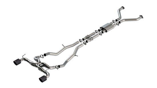 This system is a True Dual design that features a Resonator with an Internal H-Pipe, Polyphonic Harmonizer technolgy, and SwitchFire techology. All of these features combine to create the ATAK sound level, our most aggressive sound. It provides a more exciting driving experience without any drone. The Merge X-Pipe blends the combustion pulses from both sides of the engine for improved performance and a custom sound. BORLA'S Polyphonic Harmonizer Technology utilizes patented units that contain pipes of different diameters and lengths to create multiple exhaust notes that harmonize to deliver a clean, rich, full-bodied sound. BORLA'S patented SwitchFire design further blends the combustion gases and sound waves. 4.5" carbon fiber with black anodized center tips provide a custom appearance. Systems with polished phantom style T-304 stainless steel tips are also available.. BORLA Cat-Back exhaust systems feature patented technology to unleash hidden horsepower. Increased exhaust velocity adds power, driving excitement, fuel economy, and the distinctive BORLA Sound of Power respected by motoring enthusiasts everywhere. Each system is built from premium, high-quality T-304 austenitic stainless steel, superior to T-400 series knockoffs (such as 409), to give you the absolute best in performance and durability. Ultra-smooth mandrel bends ensure maximum flow & power, and precision computer numerical control (CNC) manufacturing ensures an accurate fit. Best of all, BORLA stands behind every system with a Million-Mile Warranty. Just what you?d expect from the world?s most experienced (and most winning) exhaust brand. System Features: Cat-Back Exhaust System 2.5" True Dual Design ATAK Sound Level No Drone Resonator with an Internal H-Pipe Polyphonic Harmonizer Dual 4.5" Carbon Fiber With Black Anodized Center Tips T-304 Stainless Steel Million-Mile Warranty