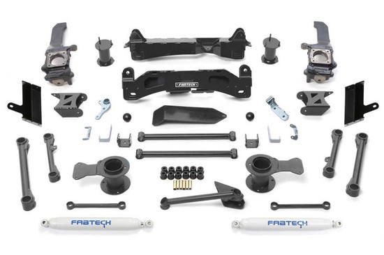 This Toyota 4Runner suspension system features Fabtech?s proven IFS technology with extended length ductile iron steering knuckles for proper electronic stability control functionality. Heavy duty 1/4" thick steel lower control arm crossmembers provide superior ground clearance while the integrated front differential skid plate adds protection to the drivetrain for offroad use. The system includes front coilover spacers that utilize the factory Toyota 4Runner Coilover shocks for a stock like ride. Rear lift is accomplished with steel coil spring spacers that retain the Toyota 4Runner coil springs for a smooth ride. Heavy duty Fabtech control link arms replace the factory arms to re-position the tire in the wheel well with the additional ride height. A stout 1/4" thick steel bracket relocates the rear Track Bar to keep the vehicle tracking proper.