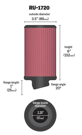 K&N Filter Universal Rubber Round Air Filter 20 Deg Flange Angle 2.25in Flange ID x 3.5in OD x 6in H - RU-1720