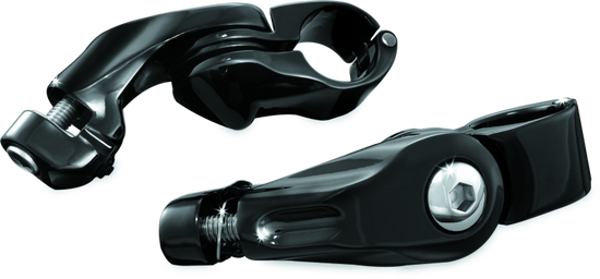 These cruise mounts with positive locking Quick Clamps offer an incredible range of adjustability. The entire assembly may be moved up or down on the engine guard. The arm and footpeg may be further adjusted along a vertical or horizontal arc. A unique clevis permits angle adjustment of the footpeg. The heavy-duty Quick Clamp and sturdy offset arm ensures that the footpegs will clear fairing lowers and will stay where you put them.
