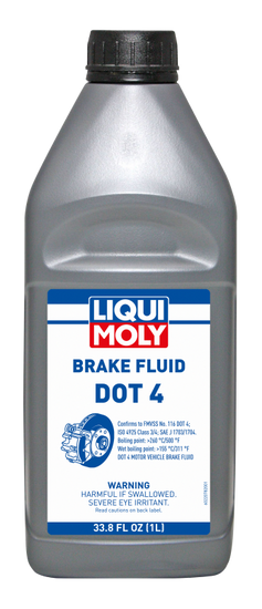 Liqui Moly DOT 4 brake fluid can be used with all conventional brake fluid bleeding devices. Liqui Moly DOT 4 brake fluid is miscible and compatible with all high-quality synthetic brake fluids. The optimal period of use for this brake fluid is, however, only ensured when it is used alone. It is recommended that the brake fluid be changed in accordance with the specifications from the vehicle manufacturer. Caution: Brake fluid corrodes the paintwork of cars; in the event of spillage, rinse immediately with plenty of water. Do not use in mineral oil based central hydraulic systems. Observe manufacturers instructions!