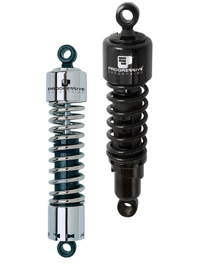 The 412 Series shocks are simply the best value shock on the market today. The 412s simple, durable design means they will be an improvement to your motorcycle's suspension performance for as long as you are riding it. The doublewall steel body construction with nitrogen charged, multi-staged velocity sensitive valving gives you smooth, consistent damping. A five-position cam style preload adjuster lets you dial in your ride whether you're a light rider or heavy hitter. With multiple options like full show chrome or black covers, chrome or black springs in progressive rate, Standard or Heavy-Duty for select applications, there is sure to be a 412 that's right for you and your bike.