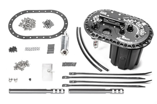 Drop-in surge tank system for competition fuel cells. Single lift pump and primary pump included. Easily serviceable with new lift-out fuel pump modules.